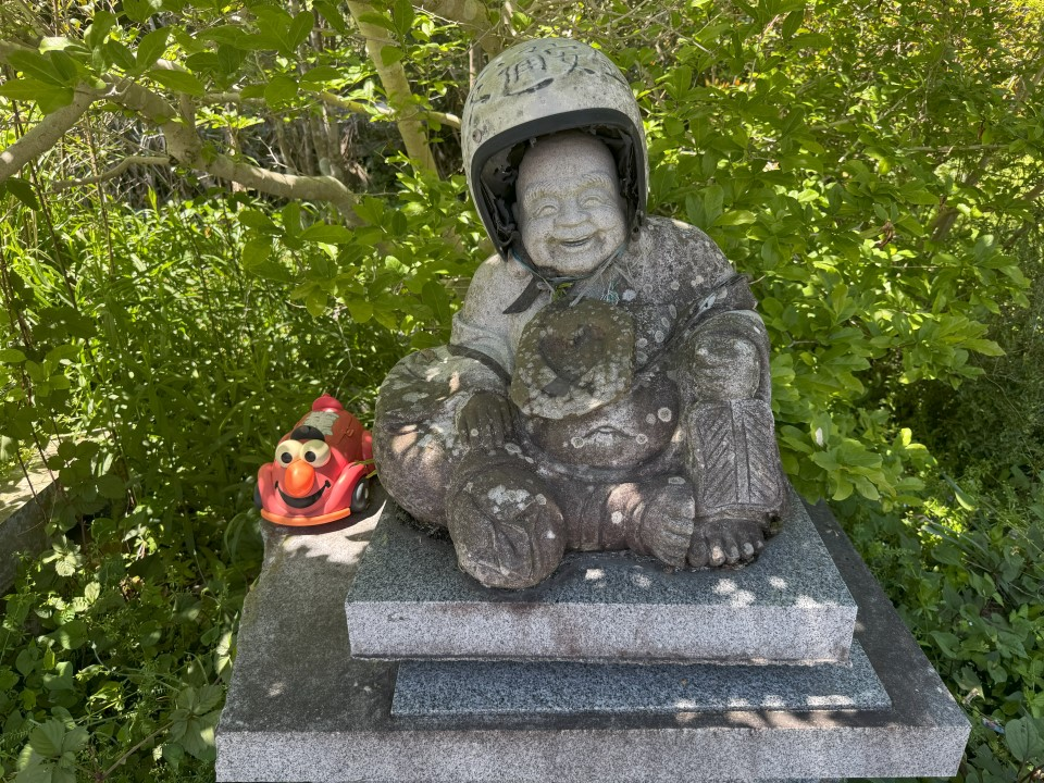 It was delightful having him as a walking companion for a couple of hours; we stopped in at a Lawson just before the bridge over to the peninsula where we were headed (visible in the distance in this picture) for a cold drink; I attempted to improve my afternoon tea smoothie technique but nope, those things really just don’t work as well as you’d like! I wasn’t a fan of walking over the bridge to the peninsula; too narrow a pathway next to a busy road, plus my hat kept threatening to blow off of my head, so I was greatly relieved when we finally arrived at the other shore. There, we agreed to go up and over the old pass to the next temple, opting out of the much easier shoreline route. I’m glad we did; the passes are getting easier and it’s great exercise!