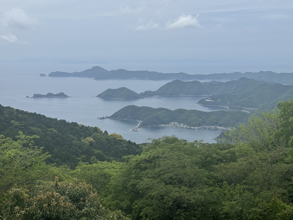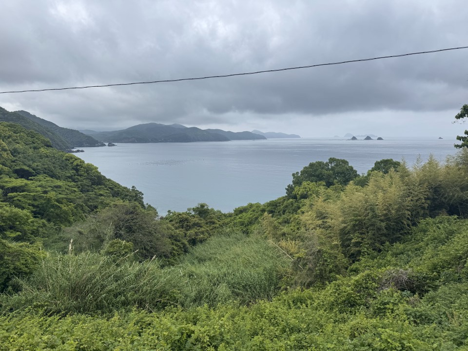 It had stopped raining just before I started walking, but that sure didn’t mean it was dry. It was warm, very humid, and uphill walking meant I sweated a lot as well, so no way was anything going to dry out any time soon. I adjusted my boxer briefs and my shorts as best as I could to minimize chafing and just took my time crawling up that hill. Surprisingly (to me), there was a lot of construction work here and there as the government is busy extending the expressway all the way to Sukumo (I’m guessing); this was a little bit sad in that it’d drastically change the experience of walking the trail (very quiet, no sign of any human stuff save for the occasional distant glimpse of a windmill) by having a huge, noisy expressway just off to the east from there. Also surprising were the large number of signs - I assume that they’d taken a lot of trouble to refurbished this trail sometime in, oh, the 1980s or 1990s, & they’d put up a dozen or two panels explaining things (in Japanese only, alas, so I don’t know what was going on). The trail kept going up; eventually, it crossed a small road at a sunny spot with a bench, so I drank all of my water before continuing upwards, and then finally it just kinda nonchalantly arrived at a spectacularly beautiful spot: