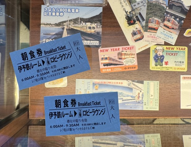 That’s right, breakfast tickets in classic, retro, old-school Japanese train style. When I checked in yesterday at the self-service terminal, the staff grew visibly excited that tonight’s guest in the Iyotetsu Room was checking in - two of them came over with a signboard (like you’d hold up at a train station) with my name on it. When the machine spit out two printed breakfast vouchers, they took them and gave me these tickets instead, printed on thick cardboard just like back in the old days. And when I went to breakfast, they literally punched it, just like you would a train ticket.