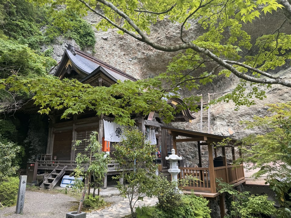 I could occasionally hear the temple bell being struck down below; I started to hear voices, some of them European, and eventually I made it down to the temple. There’s no wonder it’s considered one of the most beautiful on the trail; not only is in a spectacular location, but it’s got a bunch of bonus features. Scary giant wooden ladder that goes up the side of the mountain to a niche with a statue in it? Yup, did that. Dark cave with very dim lighting with a statue in that too? Sure, why not? A locked gate that takes you to a steep slippery incline with chains and rope you can grab onto to haul yourself up to a special ascetic training spot? Yeah no, not going to do that either today, thanks. There were an impressive number of pilgrims there today, mostly elderly Japanese who had made the long, arduous walk up from the parking lot far below - that walk would be hard for young people, much less the aged; I was impressed. I got my stamp and headed down.