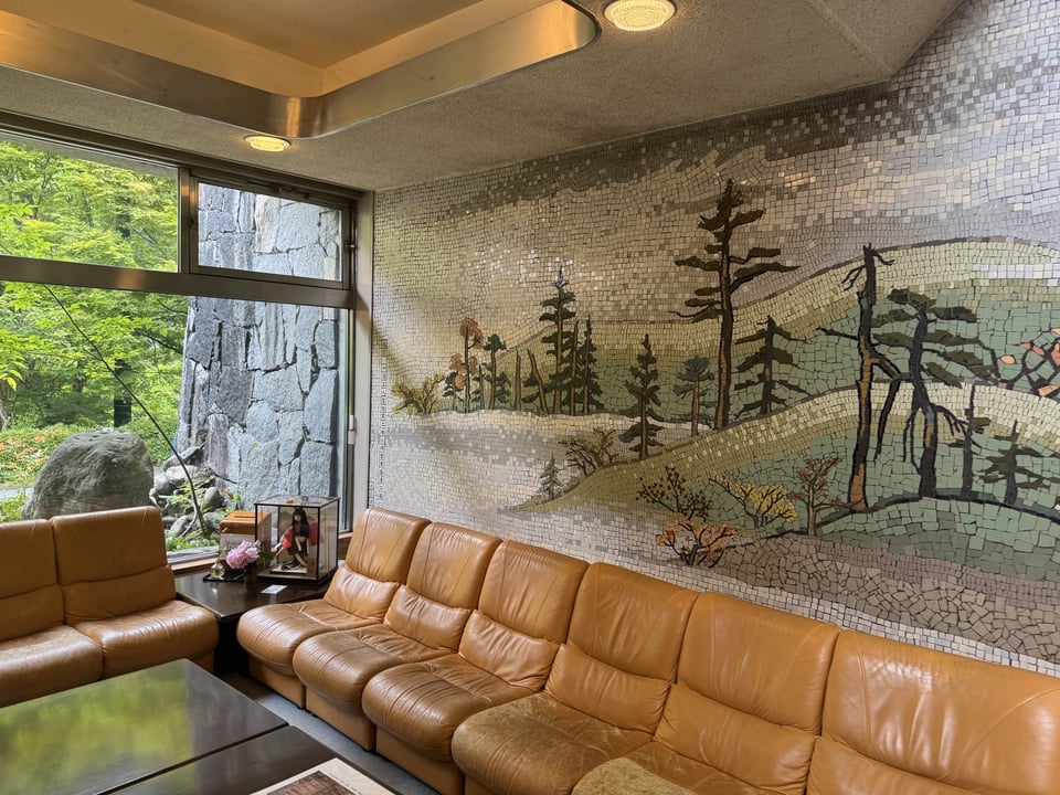 At the base, there were some souvenir stalls - a rarity - and then it was another few k on pleasant riverside trails, slightly uphill, to a very, very dated looking hot springs resort hotel that I believe was built by the Japanese government in the 1970s: Furuiwaya. I was getting really hungry - I got off one bus stop too late to get to a convenience store, so all I had was a stale red-bean doughnut and some “easy-to-drink yokan” - something like a energy gel shot, but Japanese - with me, but mostly I just wanted to see what the inside of the place looked like in 2025. They had a bag of spicy shrimp crackers for about $1, which hit the spot - and oh man, that hotel is not looking good but wow, classic in a very Bulgarian holiday camp kind of way. I mean, honestly, if this were in Palm Springs, you’d happily spend $30 on a cocktail there: