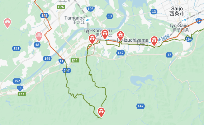 Way back in the medium planning stages of all of this, I had once thought I’d stay at a Shinto shrine next to T64 and take a bus up to Mount Ishizuchi; it was pleasurable for me to pass that bus stop opposite a Family Mart and verify that I’d gotten the schedules and logistics correct for that - but I needed the Family Mart more, the toilet specifically, and wound buying an Earl Grey tea bun thing afterwards for good measure. So: plenty of snacks.