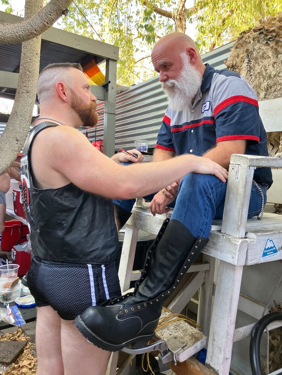 When I got back from Madrid in May 2023, I ordered a pair of used Wesco engineer boots off of eBay. I hadn’t worn boots in a while; I had a pair of Sears engineer boots in high school that I loved, but that was a long time ago. I’d wear them with 501s and a white T-shirt or flannel as that’s what I thought a Bear should look like. A career happened, though, and I lost touch with that part of myself along the way, but moving to Palm Springs got that going again. The used boots were a little bit dinged up, but Rene made them look brand new again.