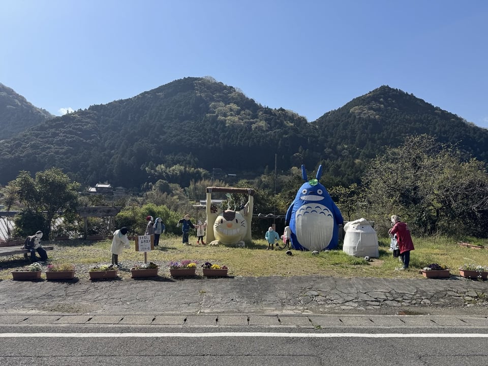 So how was today’s trail? Good. It was about 20 km from the inn to the first temple, which meant quite a long time in the forest before eventually coming down to the valley floor and the first small town, which was filled with homemade human figures doing various things (pretend traffic cop, old couple feeding birds, etc.). My favorite was a huge Ghibli appreciation tableau: