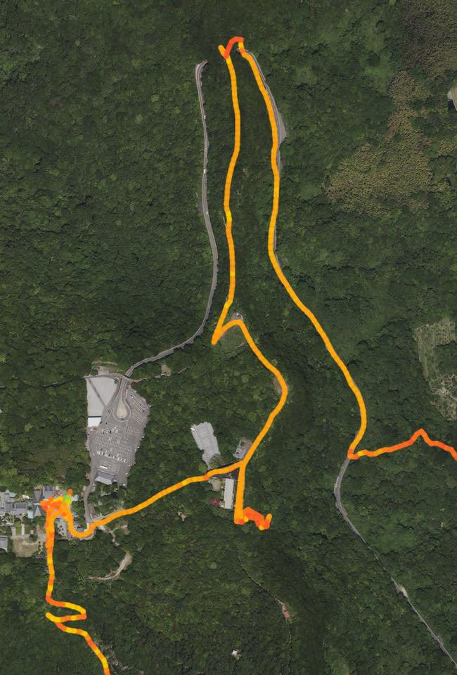 What you’re looking is T84 on the left (the dots are me walking around to the various parts to do temple stuff). Then, there’s a derelict hotel to the East; you turn right there and start descending a very steep, very slippery, moderately dangerous slope. You’ll note a lot of dots there that don’t go anywhere - that’s because a massive tree had come down in this morning’s rainstorm and completely blocked the trail. I didn’t have rope or hiking poles with me, so there was absolutely no safe way to continue… so I had to slowly make my way back up the ravine (not easy given that it was raining with some real attitude at this point) to the main trail. The clock was ticking, but I knew better than to hurry - that’s a surefire way to just make shit worse. I had a look at the map; at the downed tree, I could see a road below that the map said the trail crossed, so I thought aha, if I can just follow that road down, I can try to make up for time. Of course, that road makes a huge jog to the north before coming back down to the south… and I made the mistake of taking a paved trail, not a road, thinking they’d certainly intersect because that’s what they looked like the did on the map. But no! They do not. The trail is on the top of a ridgeline; the road goes through a short tunnel under the ridge. There is a very short, precipitous trail from the trail down to the road that did not look at all safe - but I figured I didn’t have much of an option other than to go for it, but take it slowly and do it as carefully as I could. I do not have pictures of either of these bad trails; taking pictures is risky, so I didn’t. There were some ropes along the way, but they were loosely tied and unstable, so not helpful. But I made it down okay - it just took time. I would not care to repeat that experience.