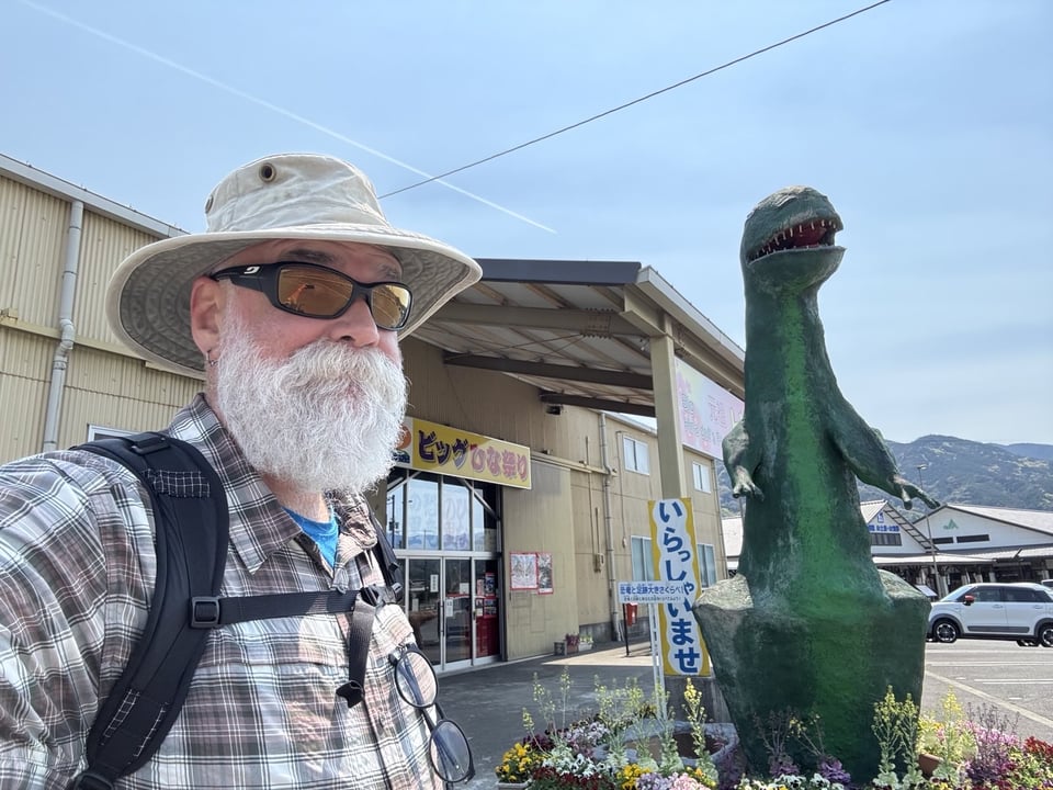 It was a mildly interesting walk; I’m glad I got off the road as often as I could to walk less traveled roads, even though that increased the overall mileage. I chatted back and forth over email with tonight’s inn, who agreed to pick me up at around 13h30; shortly before arriving at the rest area, a friendly farmer gave me some kind of citrus fruit I’ll eat tomorrow. I misjudged timing on a quick yakisoba snack, so the pickup crew caught me with a little bit off food left, but they were kind to wait another two minutes for me to finish. Oh, and Godzilla: