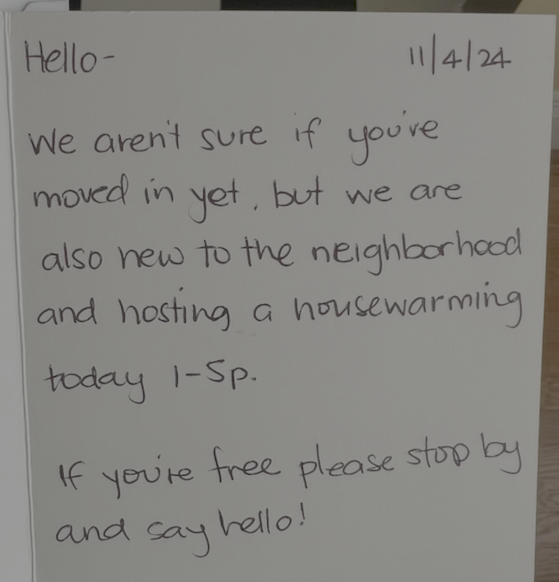 We are starting to feel the neighborhood spirit. One of the big conversations I had with Morgan is finally having a place of belonging. I have moved 5 times in the last 5 years, and frankly I’ve had enough. And every place I’ve moved to, the neighbors sure haven’t been too friendly or chatty. In the last apartment, there are familiar faces, but most leave before making a long impression. With this card, we are hoping to be friends with some of our neighbors.