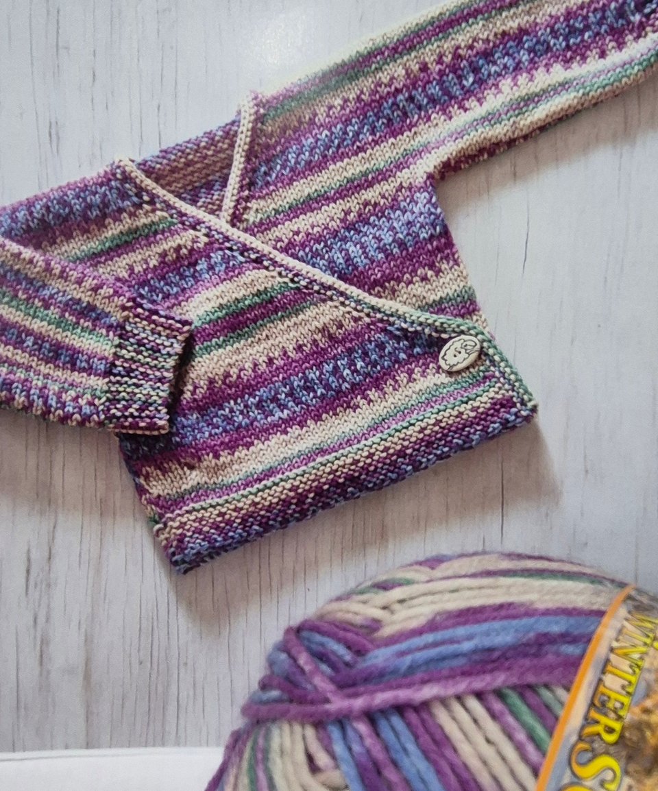 The NEW Opal 8 ply sock yarn “Wintersonne” is perfect for baby garments. The balls are 150 grs and lovely and soft. We have done this classic little crossover jacket as a kit and it’s so much fun to do in the patterned yarn. One ball will do newborn or 3 months. See the kit on our website - click on the pic below