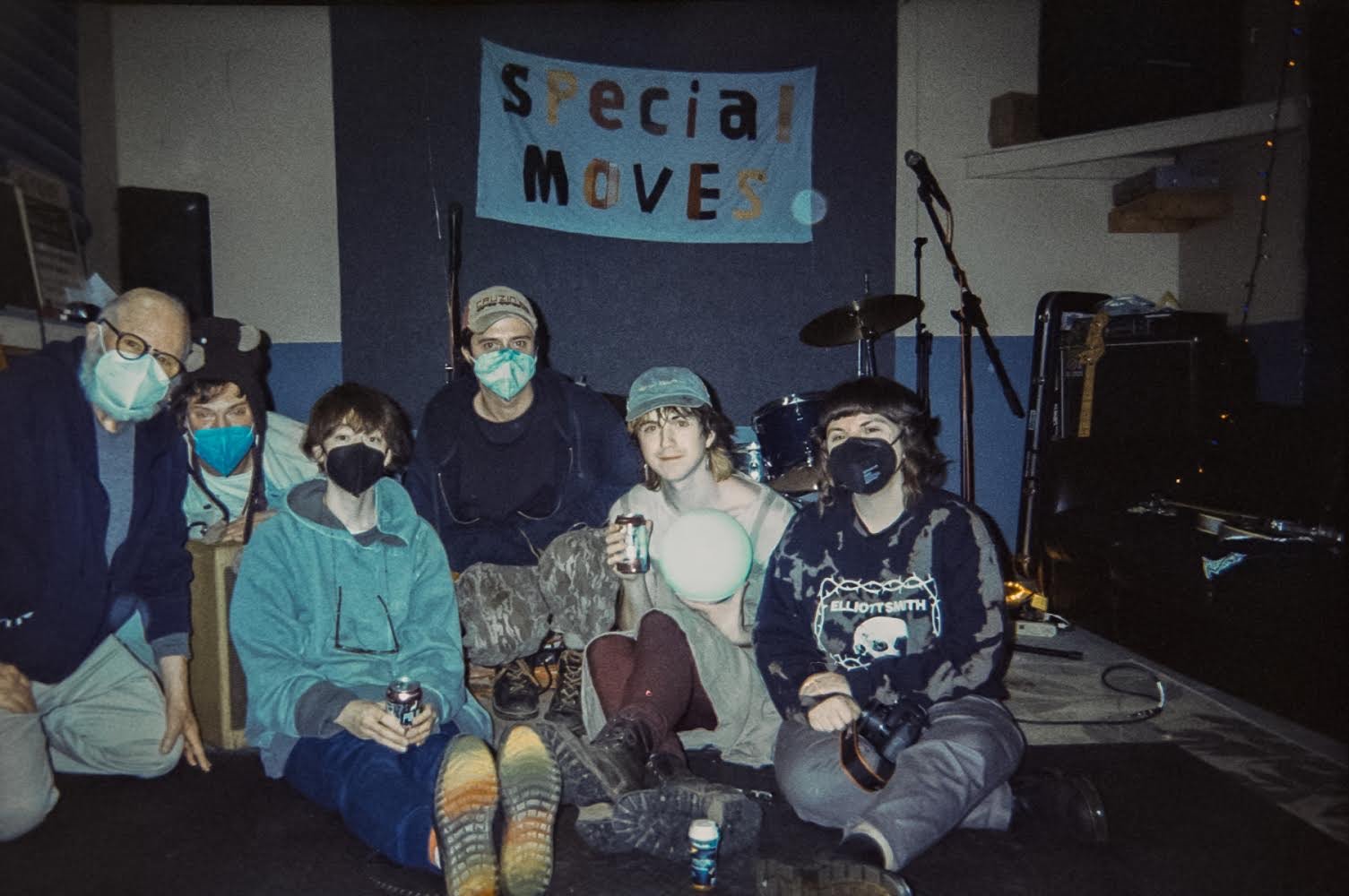 image description: some second home organizers, friends & family & our guest, who brought opie. everyone is sitting on the practice space floor at josh’s place, all but one person is masked. there’s a handmade fabric banner on the wall in the background that reads, “special moves.”