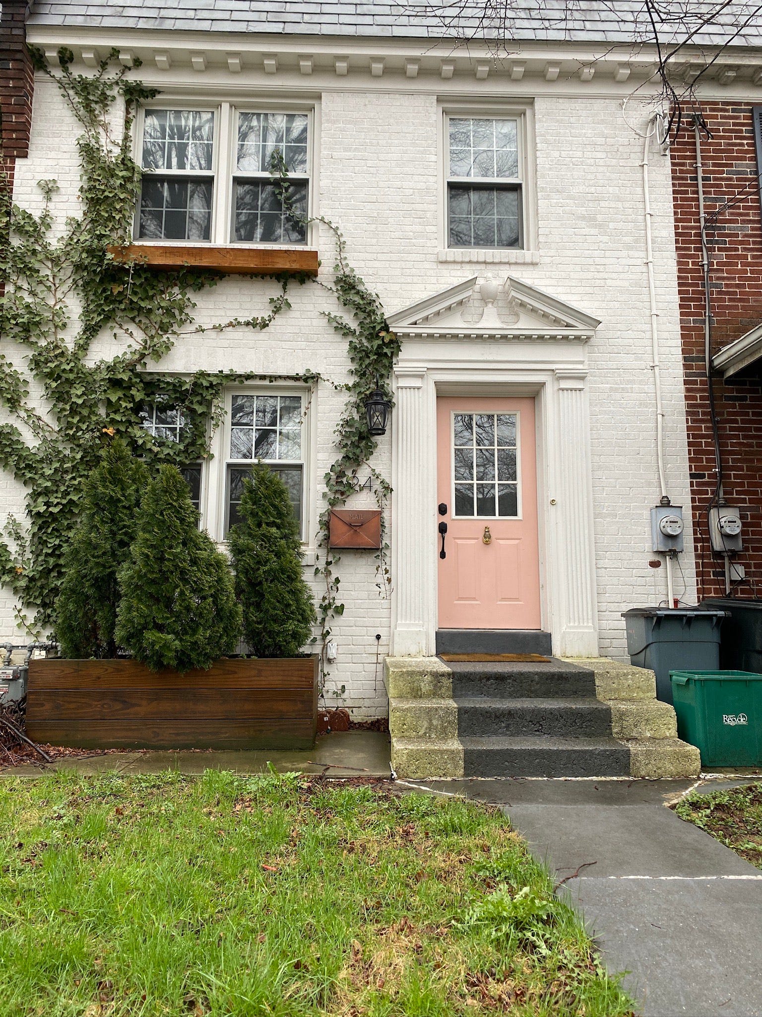 image description: a brick row home in lancaster painted white with a pale pink door, there is ivy climbing the exterior.