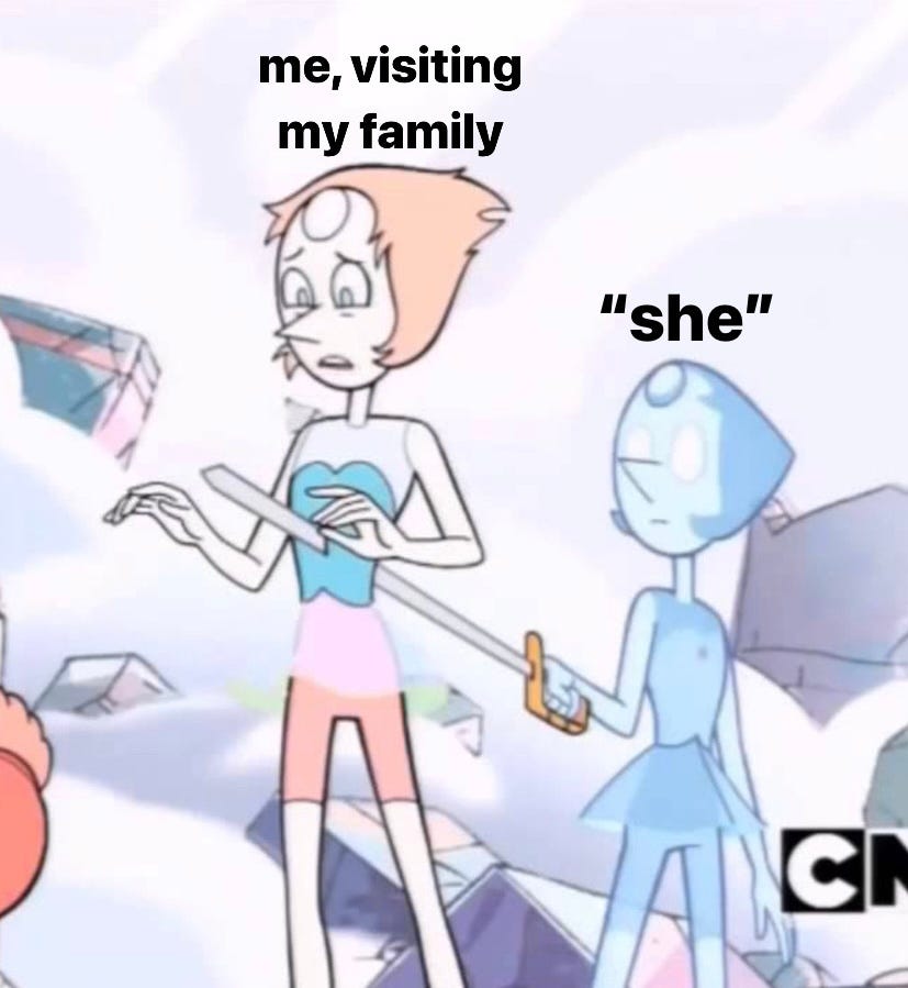 image description: a meme of pearl from steven universe. pearl is looking crushed and betrayed while being stabbed in the back by a kind of shadow pearl. text above pearl reads, “me visiting my family.” text above shadow pearl reads, “‘she.’”
