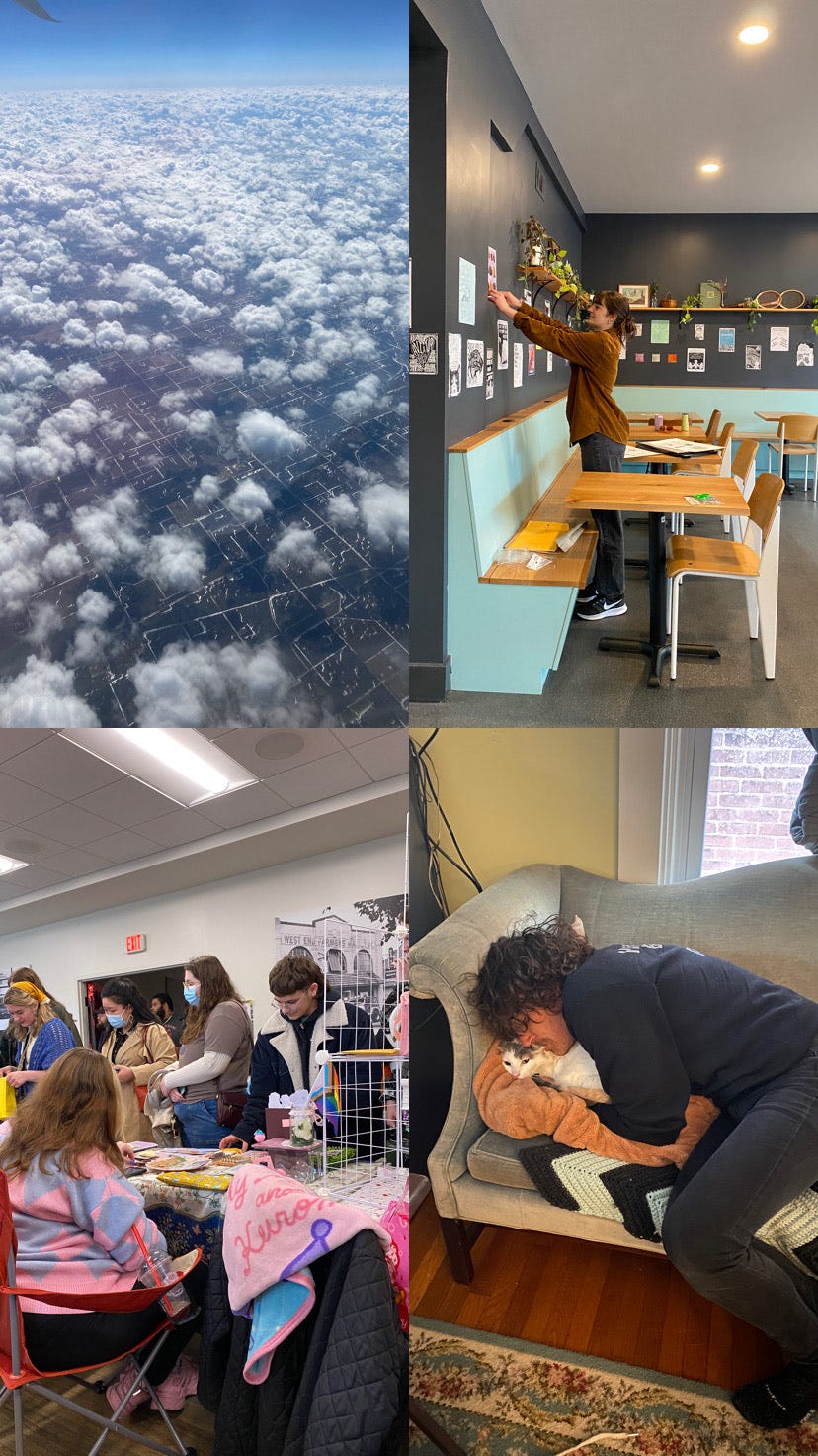 image description: 4 images, top left is a view from the plane of clouds that look like popcorn, top right is my pal danica setting up the flyer art show. bottom left is lancaster zine fest chaos, bottom right is my bff nick cuddling his cat, penelope.