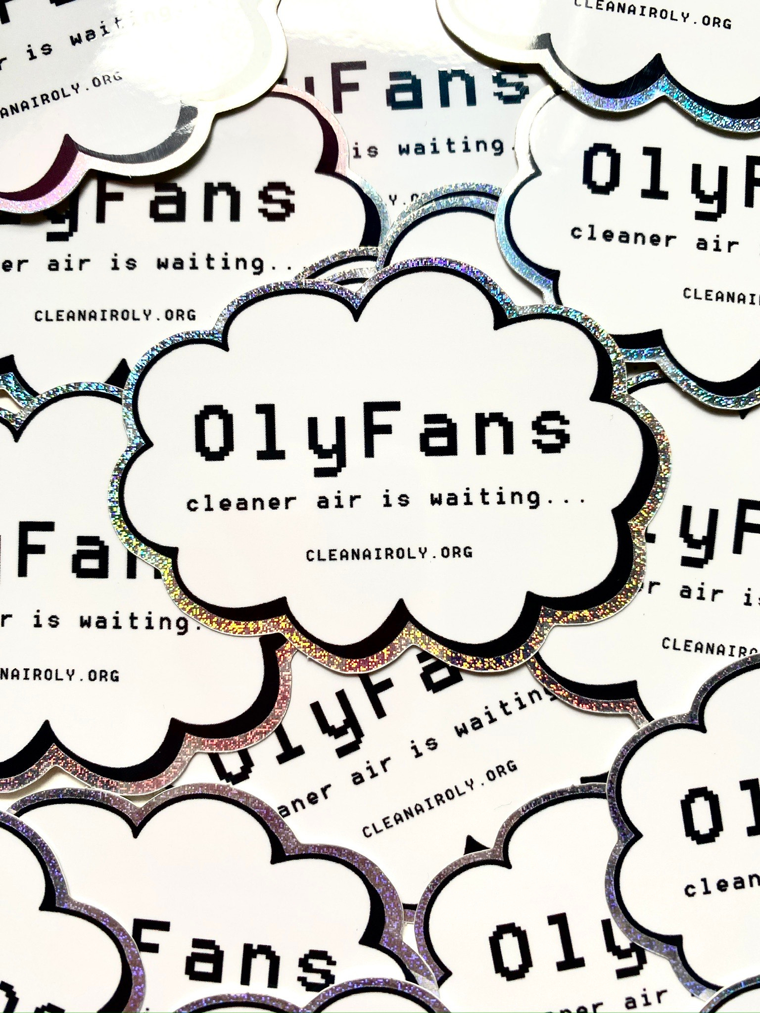 image description: a pile of cloud shaped stickers with a silver, glittery border. the inside of the clouds are white with a black drop shadow and black text reads, “oly fans: cleaner air is waiting… clean air oly dot org.”
