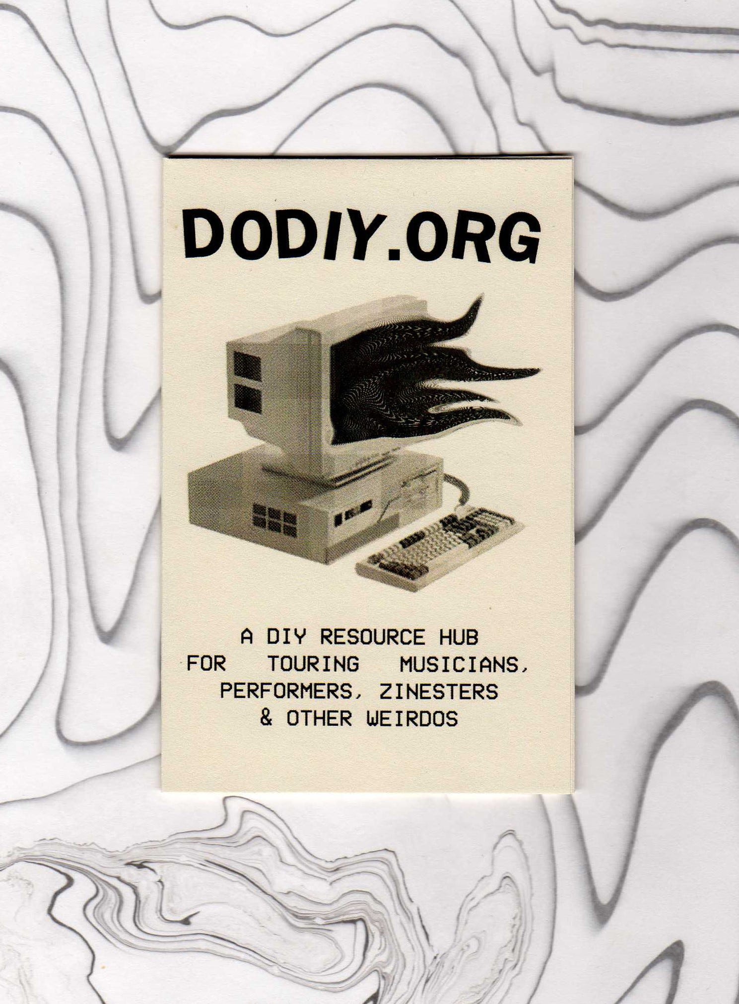 a mini zine on a marbled paper background, cover features an old desktop computer with wavy distortion coming out of the screen. text reads, “do DIY dot org. a resource hub for touring musicians, performers, zinesters & other weirdos.”