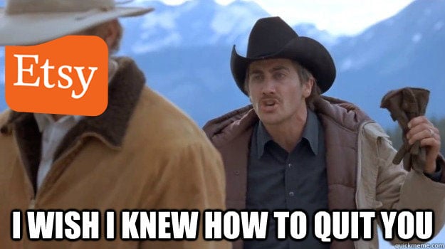 image description: a scene from brokeback mountain where jake gyllenhaal’s character is saying, “i wish i knew how to quit you” to heath ledger’s character. heath ledger’s face has the etsy logo superimposed over top of it. (yes i made this just for this newsletter, i know so many people who feel similarly).