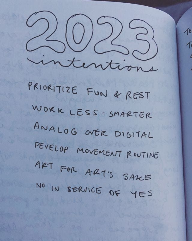 image description: text from my journal that reads, "2023 intentions: prioritize fun & rest, work less - smarter, analog over digital, develop movement routine, art for art's sake, no in service of yes."