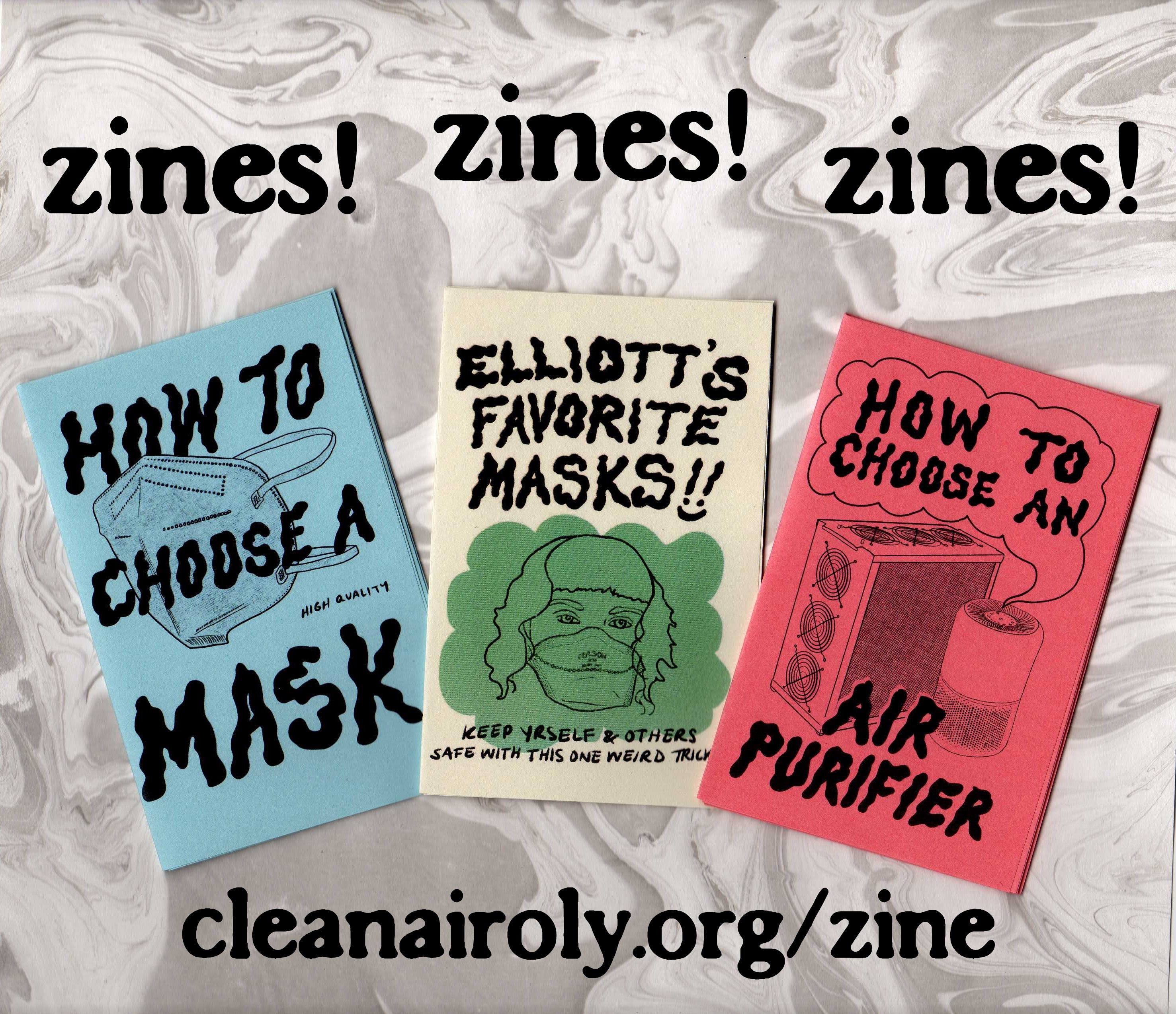 three mini zines with hand drawn covers, titled “how to choose a (high quality) mask,” “elliott’s favorite masks: keep yrself & others safe with this one weird trick!,” and “how to choose an air purifier.”
