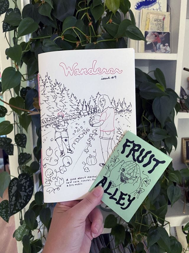 image description: a hand holding up two zines, one is half letter size with a cream cover and it's titled wanderer #9 - there's a line drawing of two people holding pumpkins in a pumpkin patch on it. the other is a mini zine on mint green paper and there's a line drawing of cupped hands holding a variety of berries with hand lettered text that says "fruit alley."