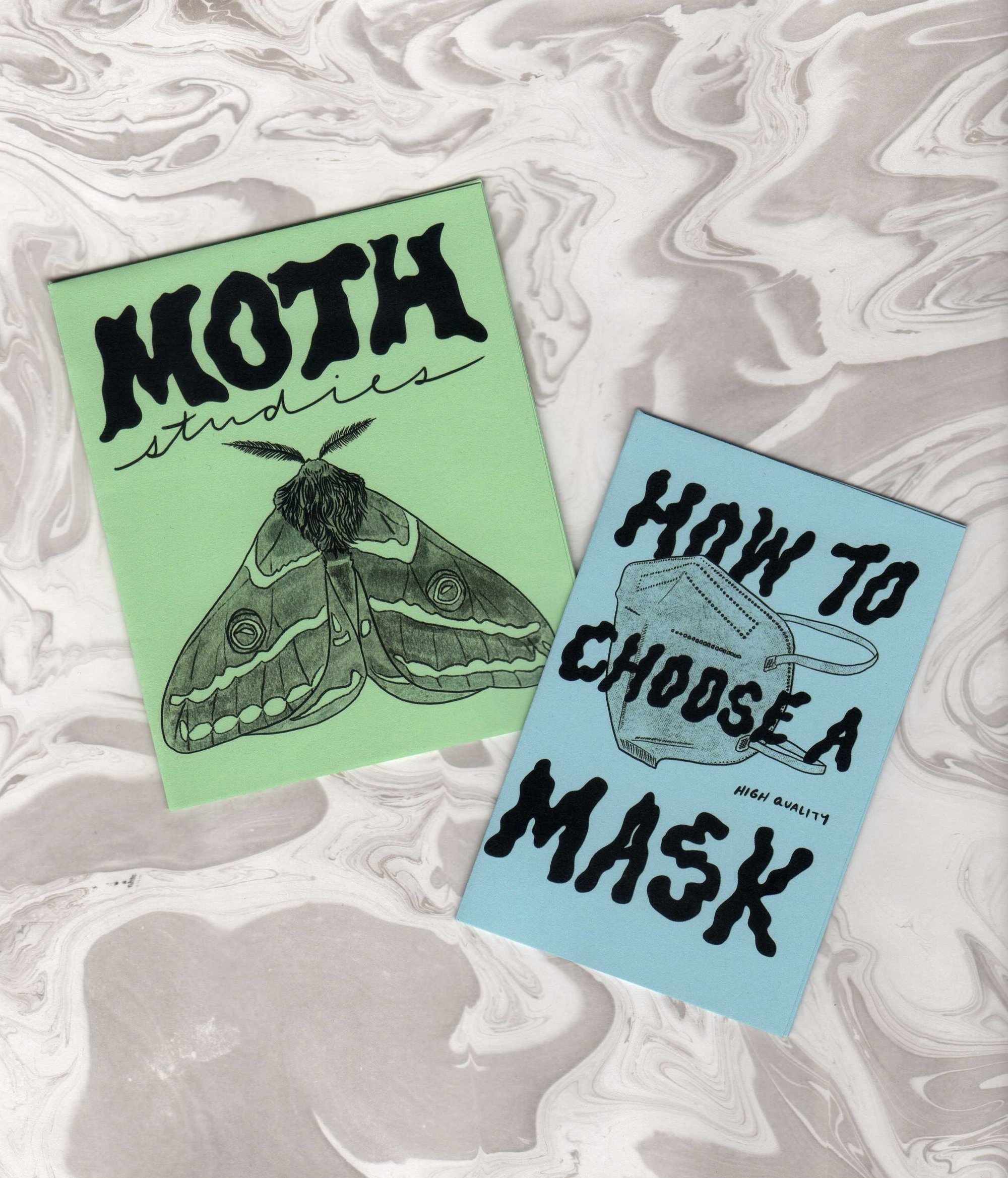 a scan of two mini zines on a grayscale marbled paper background. moth studies is a 1 sheet legal mini zine printed on spearmint green paper, cover features a drawing of a moth. how to choose a (high quality) mask is a 1 sheet letter mini zine printed on baby blue paper, cover features a drawing of an N95 respirator.