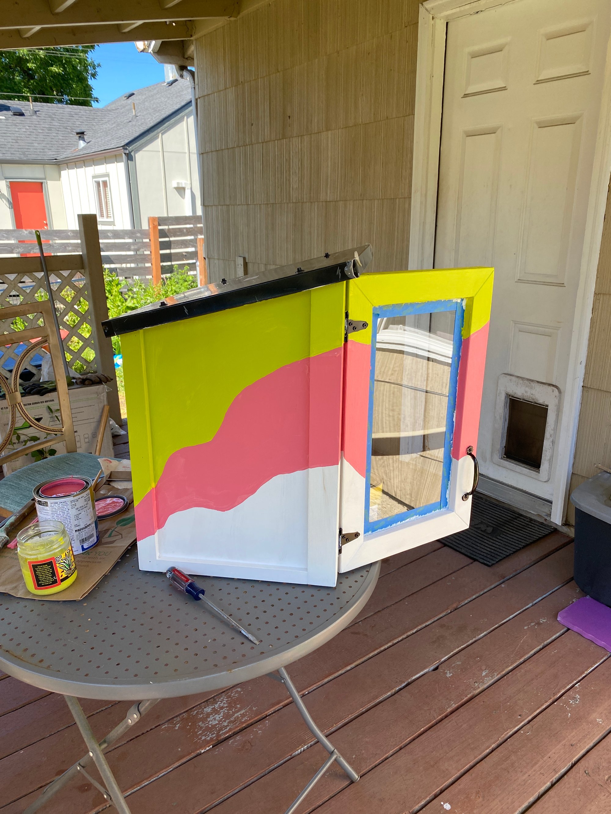 work in progress! a photo of a little free library that i am in the process of painting and modifying to use as a zine library. it’s partially painted olive green and pink in big, wavy strips.