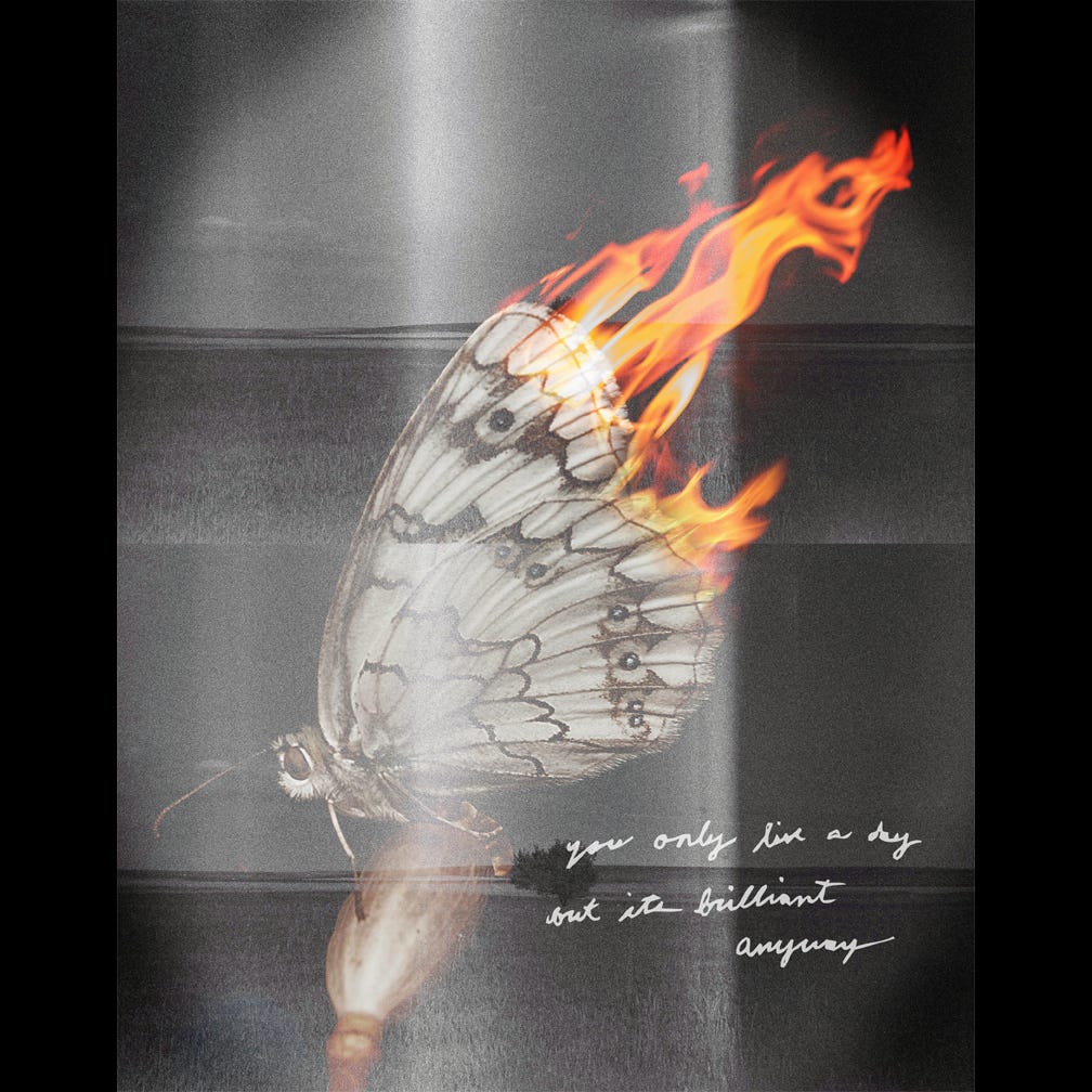 a mostly grayscale photo manipulation of a small white butterfly with flames coming off of its wings and handwritten lyrics that read, “you only live a day / but its brilliant anyway.”