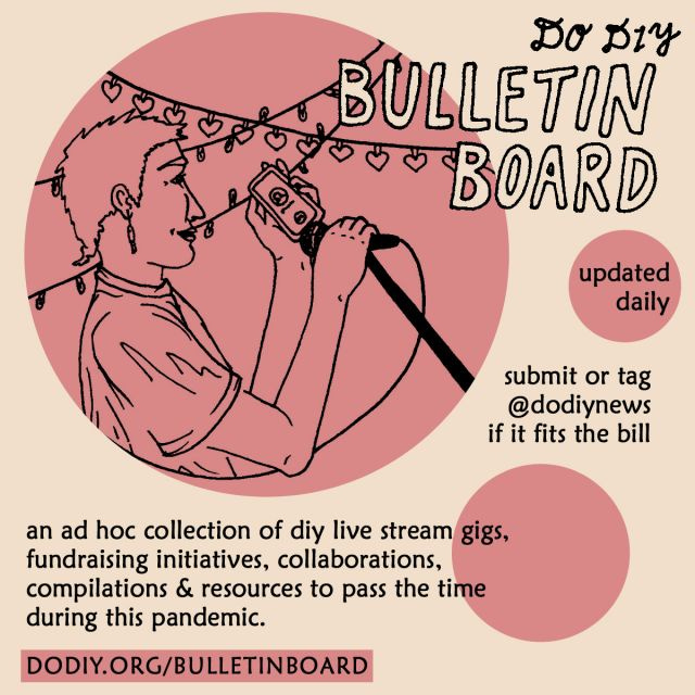andy waldron and i have put together an ad hoc bulletin board via dodiy.org that lists live stream gigs, diy space fundraising efforts, collaborations, compilations, ways to pass the time, etc. it seemed pertinent to shift focus, since no one is touring anytime soon. there's a form on the page where you can submit your thing, or you can tag @dodiynews on social media when you see something that fits the bill. i'm hoping this really takes off. andy has been doing the majority of the work, please give him something to do so that he doesn't blow through all his puzzles right away!