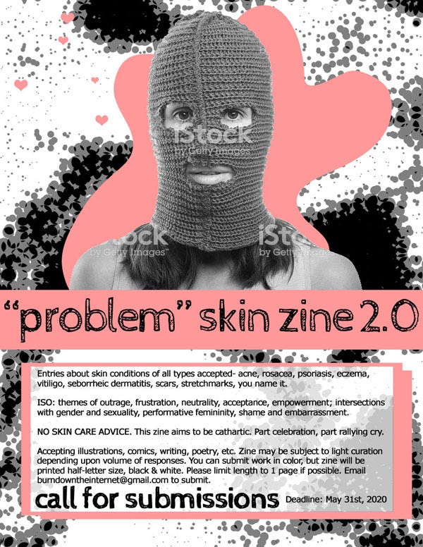 you can still sneak in a submission for the problem skin zine if you act quickly! are zine deadlines ever actually hard deadlines? i posted some pictures of my face at its absolute worst on instagram recently, and a funny thing happened. the post got a ton of positive attention. i know the algorithm favors faces, but i was not expecting that. it was super affirming, and fortunately got my submission call the visibility boost it desperately needed. social media is so weird icky to me as i get older (with the exception of tumblr, which i'll defend til the end, porn or no porn). it feels like a necessary evil of being an artist, but i greatly prefer sharing in this way instead. writing you all a letter feels so much less contrived and competitive. social media promotion is my least favorite part of art. and the commonplace nature of thirst traps as a means to sell art is a close second. i just keep hoping i can sub genuine vulnerability for being conventionally attractive to get my edge, ya know? i hate that i even have to think about any of this, thanks again capitalism (: