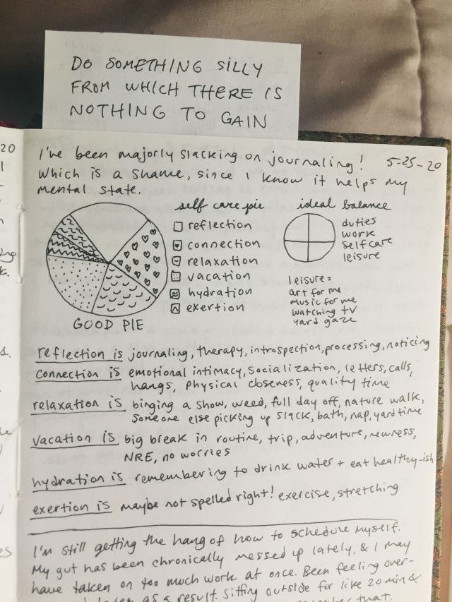 self-employment has been pretty awesome so far. i have work, a lot of it! it sounds super woo, but i feel like the universe is rewarding me for finally doing the thing i've wanted to do forever. i'm still figuring out how to schedule myself, though. if you're a self-employed creative person, please share your wisdom! i am practicing radically accepting that some days i will get overwhelmed and cry into my breakfast burrito. everyone has different capacities, and beating myself up over mine hasn't changed it yet. some days, i will have to give up on my to-do list and prop myself up in bed with netflix and a heating pad. the subconscious weight of chronic pain and illness is totally a thing. doing your best doesn't mean overworking yourself! sorry for the platitudes, but capitalism sucks, and my default mode is buzzing around trying to be constantly productive. here's a glimpse into my journal, where i'm trying to interrupt that process: