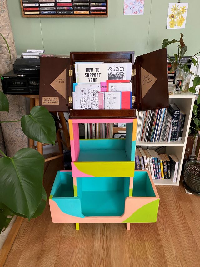 [ ID: little free zine library sitting on it's flamboyantly painted throne before it was emptied out ]