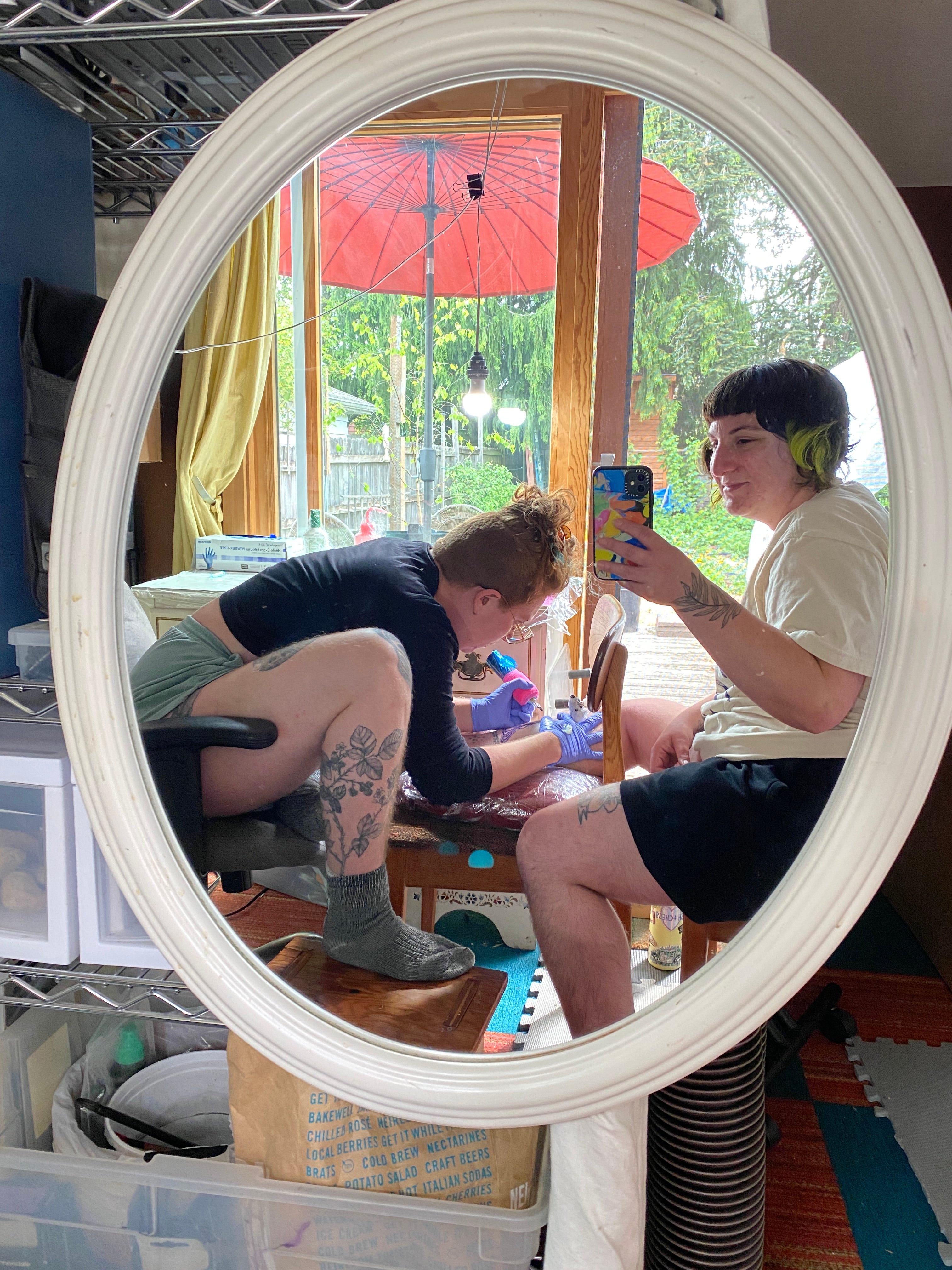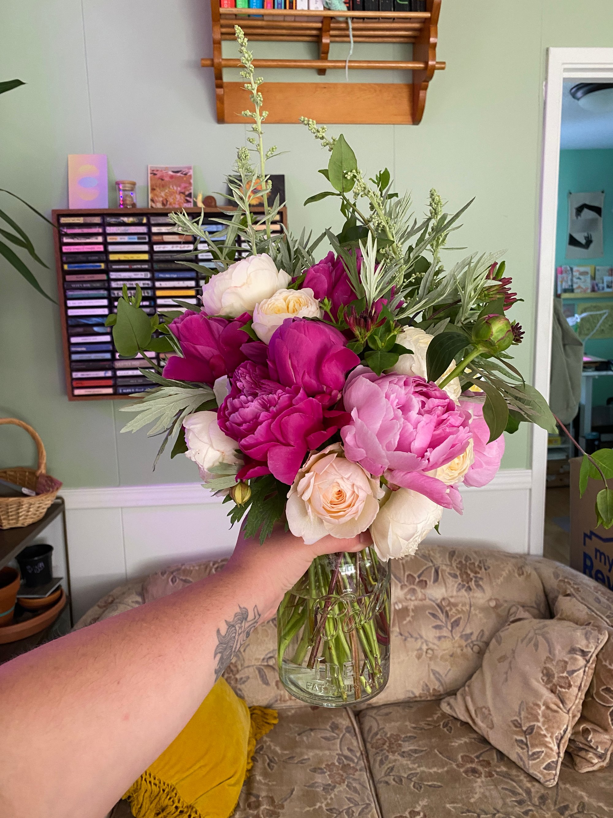 i got to sit between ellen and mara <3 i saw lots of friendly faces and i got to meet someone from freakscene! soooo many people showed up for me. clover ordered extra kn95s at the last minute, kyle helped me load in and out, eli brought me lunch, william came all the way from tacoma to table masks all day, ember delivered me a beautiful bouquet of flowers that lanen picked from their backyard. kelsey gave me a zine fest shirt cuz i forgot to bring a blank to be screen printed, other friends texted me to wish me well or ask how it went. feeling very held and supported lately and it’s really nice. i know some incredibly sweet people.
