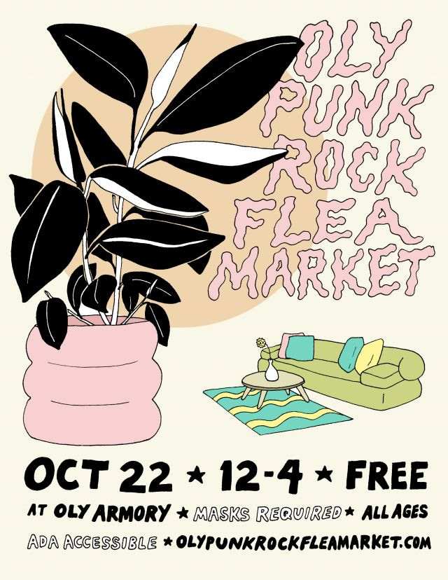 image description: a flyer with a drawing of a really big plant in a really small living room that reads, “oly punk rock flea market. oct 22nd, 12-4, free. at olympia armory. masks required, all ages, ADA accessible. oly punk rock flea market dot com.”