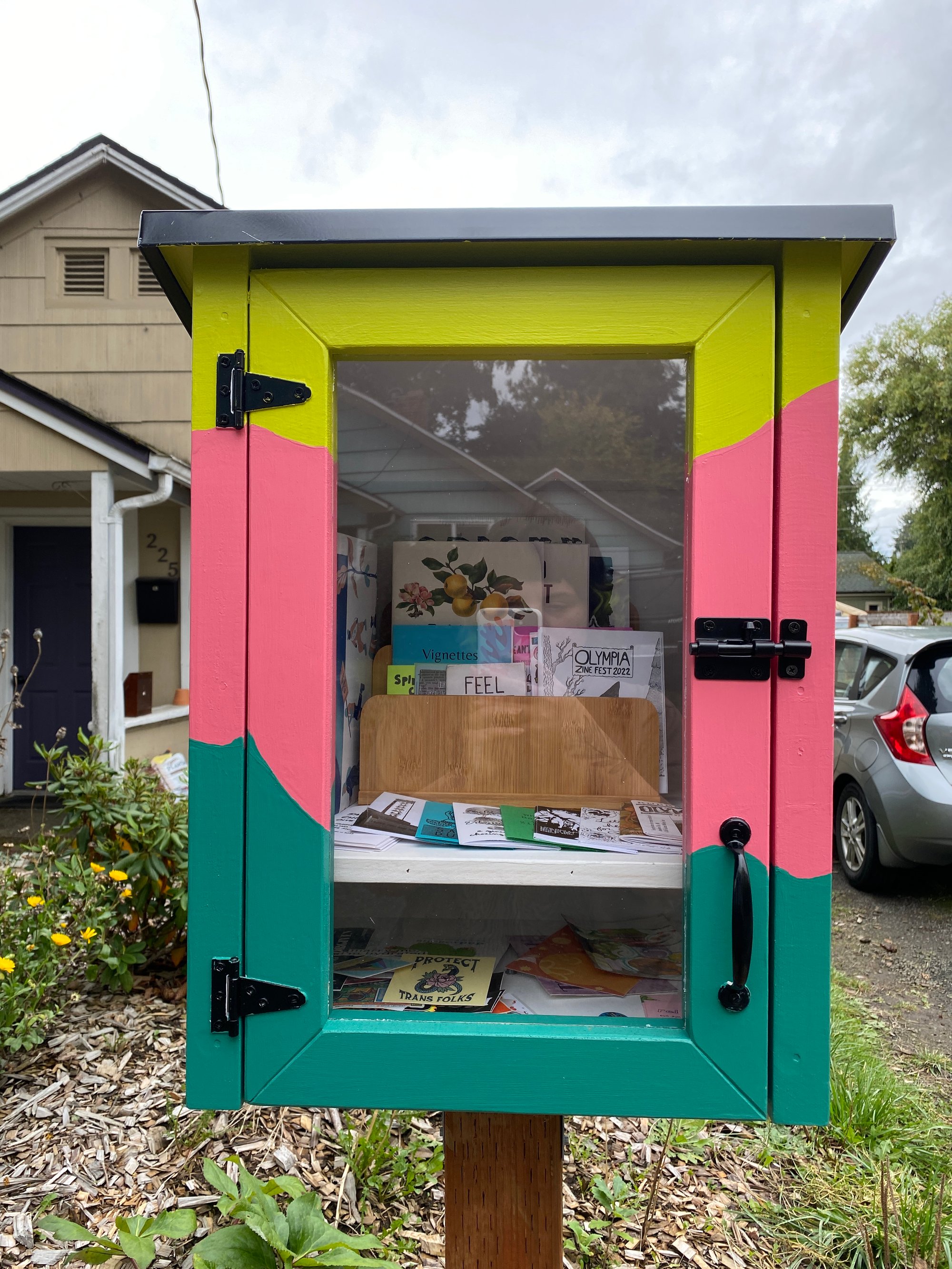 a colorful little free library filled with zines.