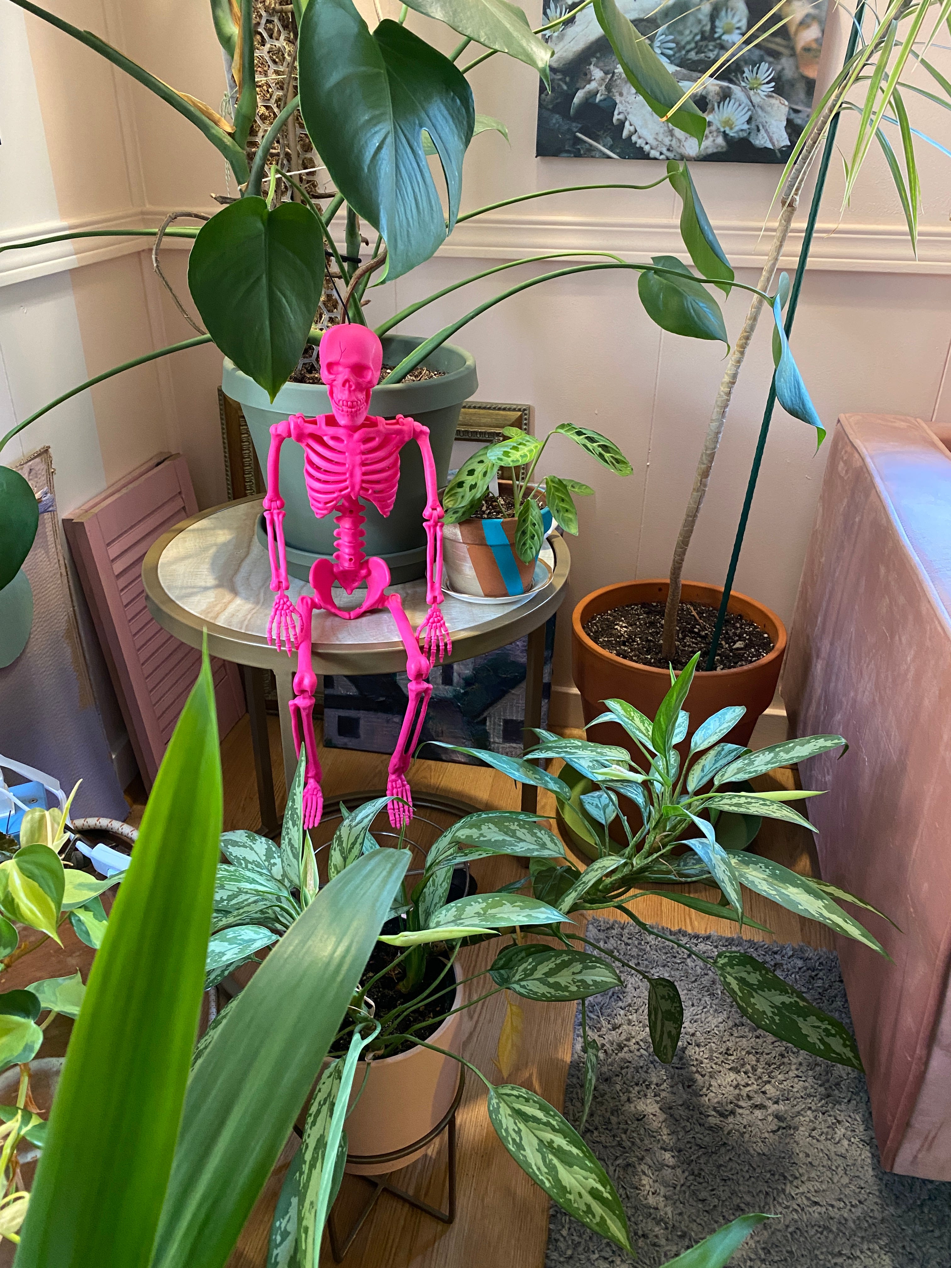a bright pink skeleton sitting on an end table in a sea of house plants.