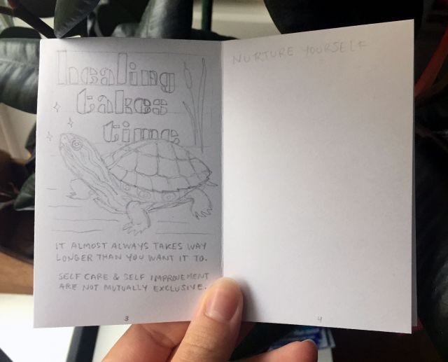 i have a couple mini zines in the works right now as well. one of them is about some small things that bring me joy, the other is a tool to help practice self-compassion during tough times. i'm hoping that i'll finish them, but i'm not holding myself to it. i'm liable to fall prey to "the shoulds," but i'm trying not to engage in must-erbation for the health of my already overwhelmed brain.