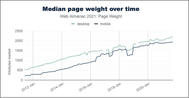• A Creative Good member asked about "the energy consumption of cookies and trackers initiated by every website visit." I did some research and found that, indeed, median webpage weight is going up. Here's the relevant chart from the HTTP Archive: