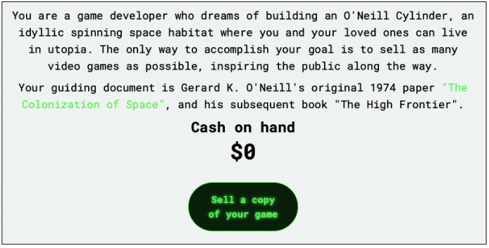 This is admittedly pretty geeky. First, it’s a clicker game – that is, you click buttons to increase your score in order to “level up” and unlock more powerful buttons. There are lots of clicker games out there, but this one dreams of a Dyson sphere (wiki), the notional celestial object that could surround the sun like a shell and harvest its energy. I won’t say more. No spoilers. But here’s the link to try it out.