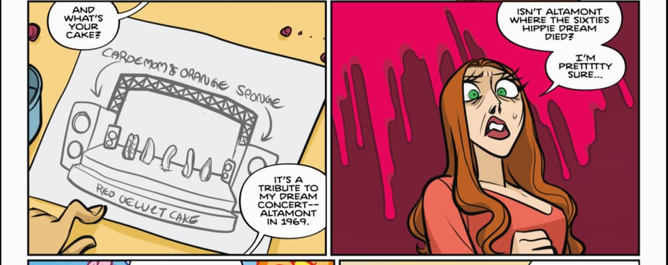 The flashbacks are key here because really this story is unfolding across four timelines. And each timeline has its own color palette. There are even panels where two different color palettes are merged to give the reader a greater sense of how things got to that moment or who exactly is involved.