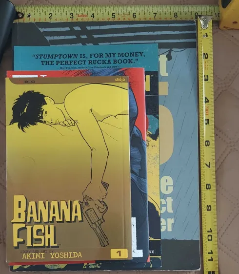 In order to show the differences in trim sizes between European albums, U.S. graphic novels, and manga tankobons I made this crudely staged stack of books. Within each industry, especially manga, there is great variety in book sizes but these represent the average. You can clearly see how much larger the European albums are compared to the other books