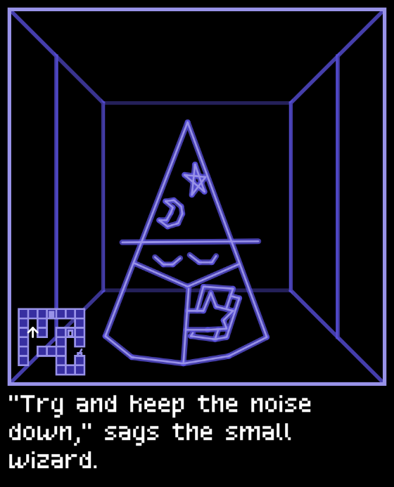 The tool exports finished drawings as a series of comma-separated vectors, which I can then import into my project:Image description: The same wizard character in a 3D maze. “‘Try and keep the noise down,’ says the small wizard.”