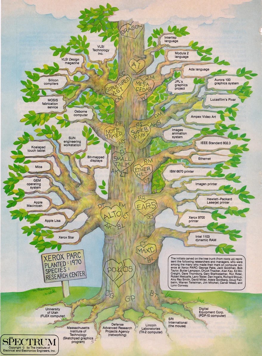 This awesome tree illustration by the IEEE team shows the influence that the PARC researchers and engineers had on how we interact with our virtual world. Each branch represents the technologies that stem from their research. Little hearts with the name of the projects and the initials of the developers are in the tree’s trunk. I really like it: