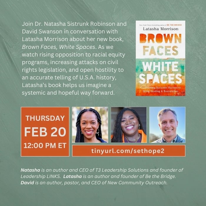 Following up on our recent conversation, next week Dr. Natasha Sistrunk Robinson and I will engage our friend Latasha Morrison in conversation about her new book, Brown Faces, White Spaces. You can register here to join us.
