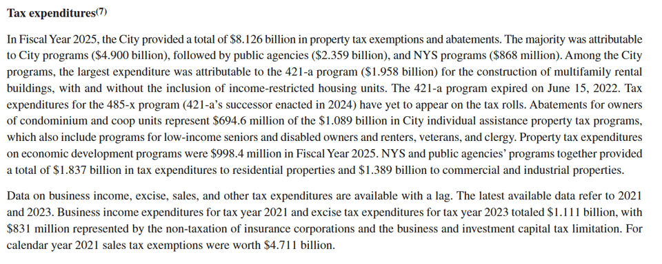 According to Lander’s office, the city left about $8 billion on the table, five of which was city-based. The biggest tax expenditure in the local category was a program called 421-a that gave tax incentives for multi-family housing construction. And while this program ended in 2022, another one, called 485-x has just come into being last year and we haven’t seen those abatements. Wonder how much there’ll be!