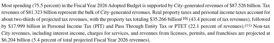 The city generates $87.526 billion locally, and 75.5% of its spending comes from this revenue. $81.3 billion of that is technically city-generated. Here’s the breakdown of the majority of those revenues:
