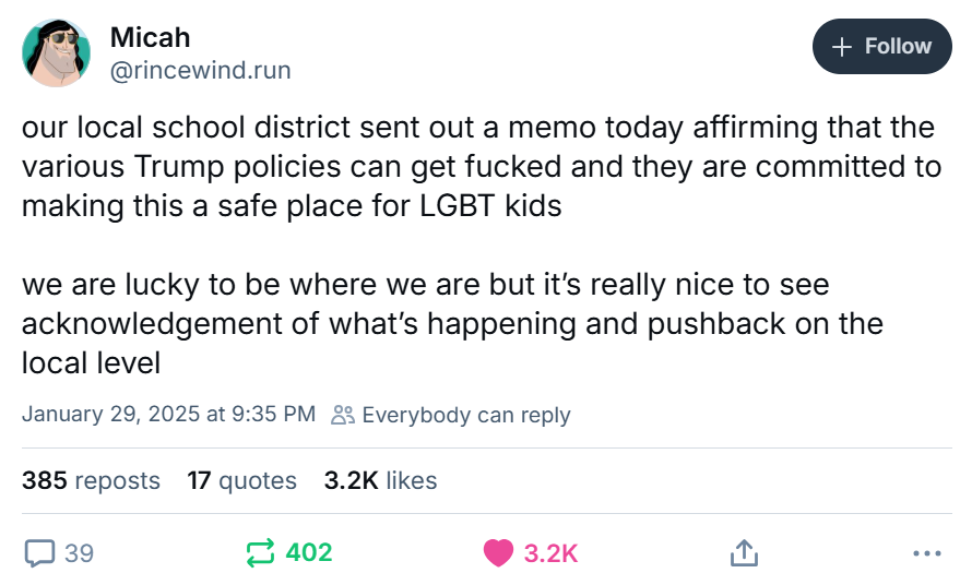 But what’s the reality elswhere and structurally? There’s been a pretty thorough pushback at the state and district levels against the executive orders. If state departments of education and school district leadership say this is bullshit, they have a lot of leverage. Be like this district: