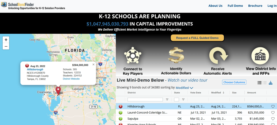 I was shocked to find out about schoolbondfinder.com, a service that tracks school bonds specifically. You can search for information on school bonds across the country from an infrastructural perspective, with up to date information about leaders, consultants, architects, etc. It also tracks upcoming bonds that are in process of being planned (which would be super helpful for green school infrastructure organizers, since we can know which districts are still considering their projects). It’s a prescription service, but the founder is very amiable and provides free subscriptions for research under certain conditions.