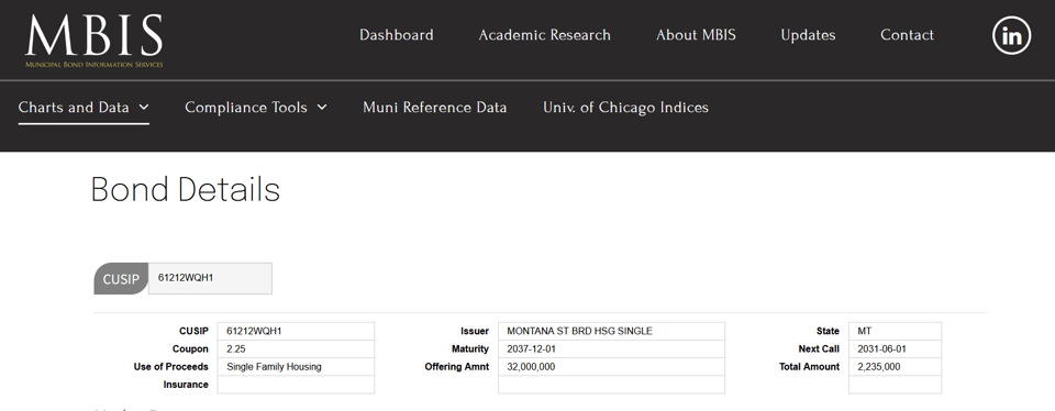 Municipal Bond Information Services (MBIS) also has a relatively pleasing dashboard, and you can search by CUSIP number to get all kinds of information about bonds. It also finds comparable bonds and charts yield, spread, and price. It’s somewhat investor-oriented but it’s still a free source of information about municipal bonds.