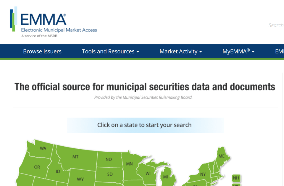 The original and best way to find out about municipal bonds is the Electronic Municipal Market Access dashboard (EMMA), which is free and open to the public. It takes a bit of searching to find the right entity for your inquiry, but if you just keep searching you’ll find a page that has recent bond documents, financial disclosures, event-based disclosures and the like. It’s my go-to. There’s just something about EMMA.