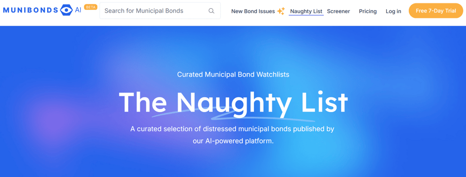 The final venue, MuniBonds.AI is a municipal bond clanker. They use artificial intelligence to track municipal bond information for potential investors. The use of AI is pretty astounding, including the creation of podcasts you can listen to, generated by the AI program that analyzes documents and creates podcasts. They have a naughty list where you can listen to the fake people talk about the real municipal finance in Nassau County, Long Island.