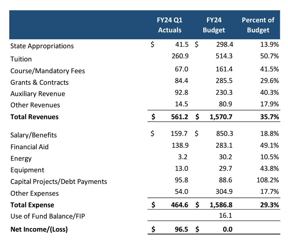 When we look at the university's quarterly reporting from Q1 of 2024, here are the percentages of revenues and expenditures.