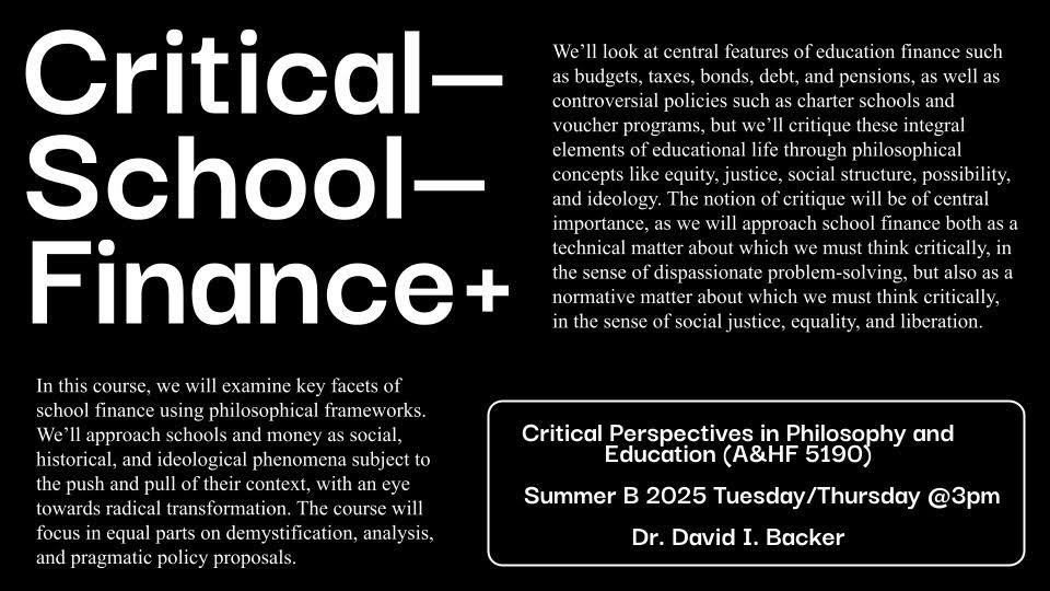 If you know any graduate students in New York City (they can be attending any programs in the consortium) feel free to forward the course along! I’m looking for some critical school finance researchers interested in using critical-theoretical frameworks to understand the nitty-gritty of schools and money.